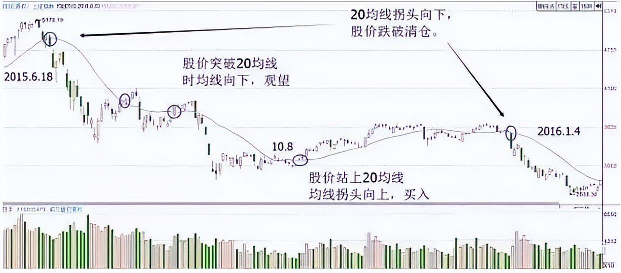 3、股价上涨一段后,20均线拐头向下且股价在20均线之下,卖出。