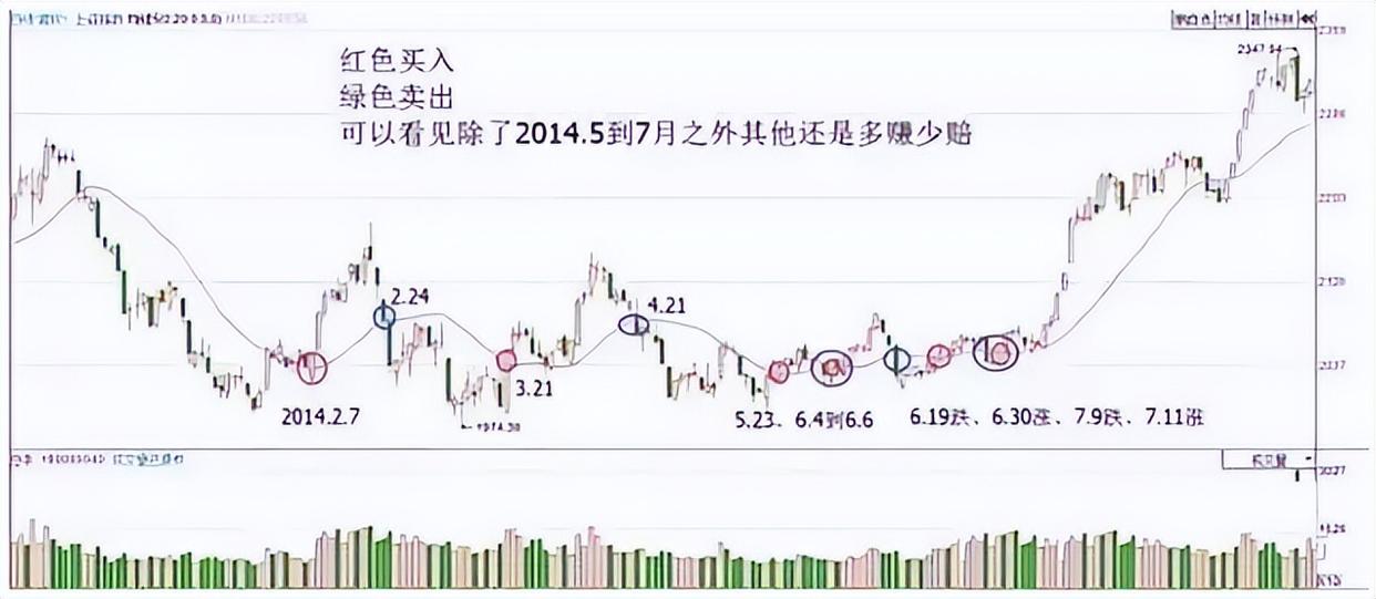 3、20均线的劣势:在震荡市中,多赚少赔、赚赔各半。