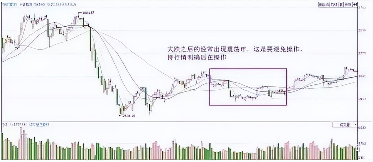 震荡市经常出现在一波大跌之后,或者是一波大涨之后。大涨之后的是卖出的信号,这里我们不讨论。在一波下跌之后经常会出现震荡市盘底,而且在接近变盘时震荡越频繁。